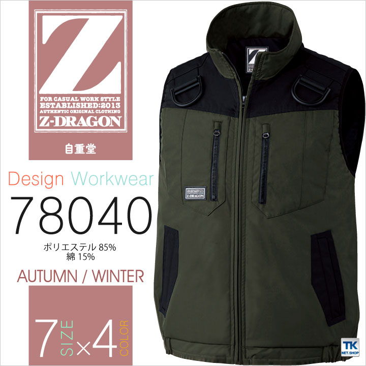 Z-DORAGON 自重堂 78040 防寒ベスト 商品の特長 T/Cタフタ×高強度コーデュラファブリック 背中にランヤード取付口を装備した フルハーネス対応防寒ベスト 時代とともに多様化する消費者ニーズに応え、 企業向けワークウエアのみならずファッションに 敏感な個人ワーカーにも響く、洗練されたスタイリング。